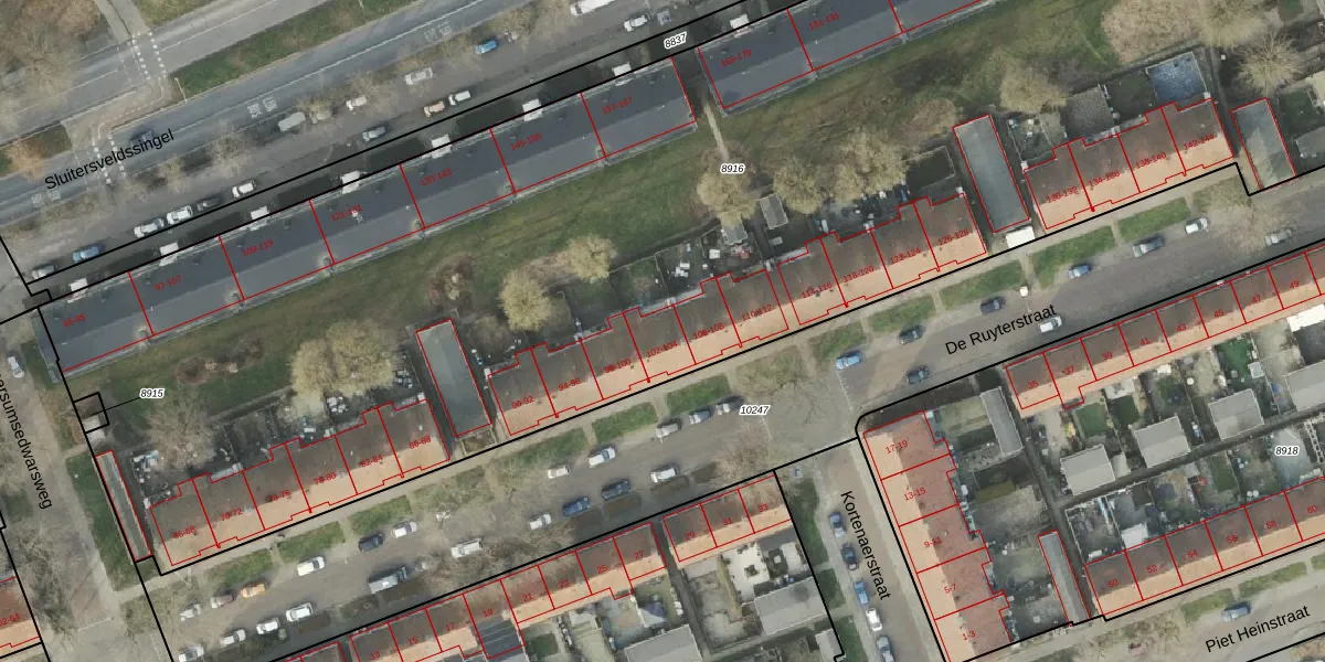 Het perceel waarop De Ruyterstraat 102 staat heeft een oppervlakte van 9675 m². Dit is een zeer groot perceel. De perceeloppervlakte wordt geregistreerd door het Kadaster. Gedetailleerde informatie over de maten van dit perceel kunt u vinden in het rapport Kadastrale kaart met maatvoering van De Ruyterstraat 102.