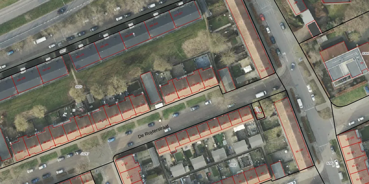 Het perceel waarop De Ruyterstraat 136 staat heeft een oppervlakte van 9675 m². Dit is een zeer groot perceel. De perceeloppervlakte wordt geregistreerd door het Kadaster. Gedetailleerde informatie over de maten van dit perceel kunt u vinden in het rapport Kadastrale kaart met maatvoering van De Ruyterstraat 136.