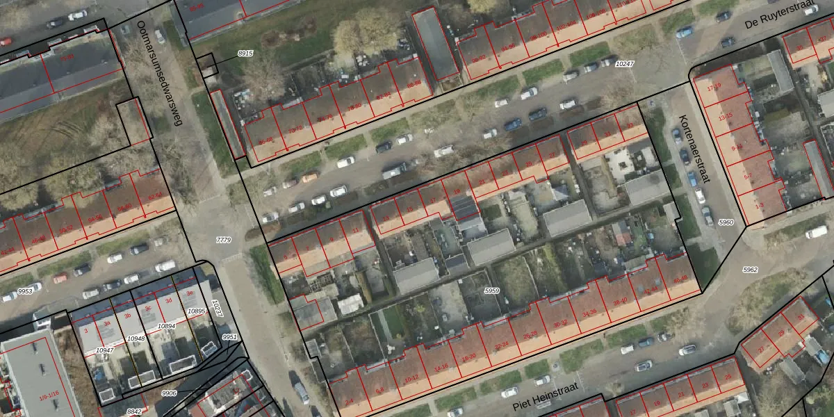 De Ruyterstraat 15 is gelegen op kadastraal perceel AML01B5959. Deze kadastrale aanduiding is uniek en wordt gebruikt door het Kadaster om eigendomsrechten en andere zakelijke rechten vast te leggen. Het perceel maakt onderdeel uit van de kadastrale gemeente Ambt-Almelo.
