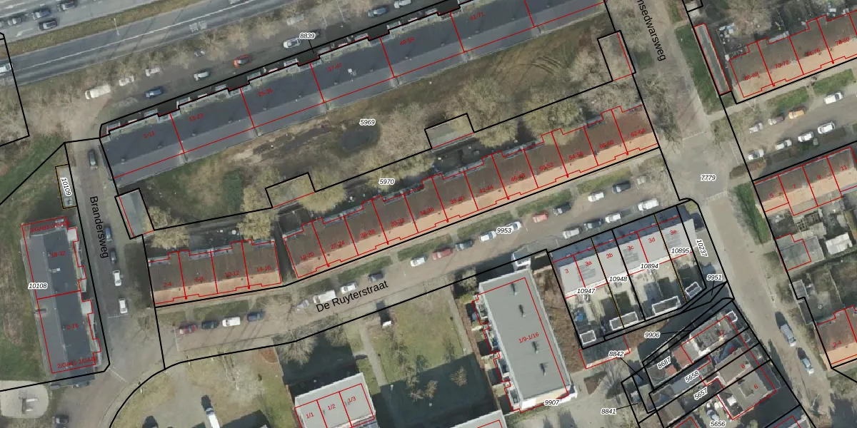 Het perceel waarop De Ruyterstraat 34 staat heeft een oppervlakte van 2420 m². Dit is een zeer groot perceel. De perceeloppervlakte wordt geregistreerd door het Kadaster. Gedetailleerde informatie over de maten van dit perceel kunt u vinden in het rapport Kadastrale kaart met maatvoering van De Ruyterstraat 34.
