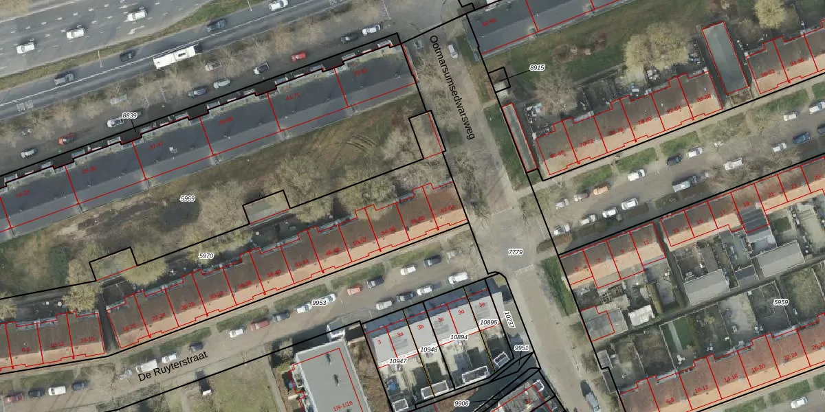 Het perceel waarop De Ruyterstraat 60 staat heeft een oppervlakte van 2420 m². Dit is een zeer groot perceel. De perceeloppervlakte wordt geregistreerd door het Kadaster. Gedetailleerde informatie over de maten van dit perceel kunt u vinden in het rapport Kadastrale kaart met maatvoering van De Ruyterstraat 60.