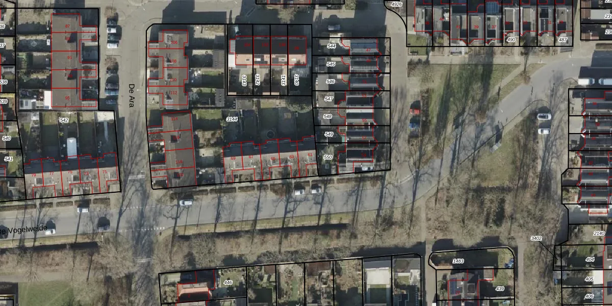Het perceel waarop De Vogelweide 61 staat heeft een oppervlakte van 2181 m². Dit is een zeer groot perceel. De perceeloppervlakte wordt geregistreerd door het Kadaster. Gedetailleerde informatie over de maten van dit perceel kunt u vinden in het rapport Kadastrale kaart met maatvoering van De Vogelweide 61.