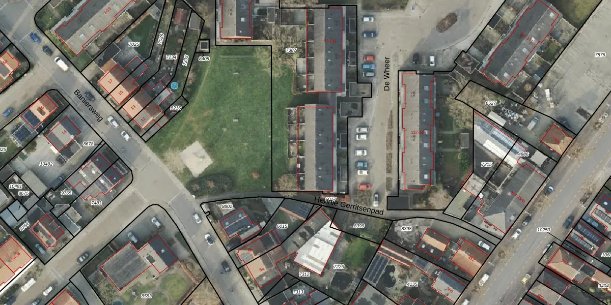 Het perceel waarop De Wheer 121 staat heeft een oppervlakte van 2527 m². Dit is een zeer groot perceel. De perceeloppervlakte wordt geregistreerd door het Kadaster. Gedetailleerde informatie over de maten van dit perceel kunt u vinden in het rapport Kadastrale kaart met maatvoering van De Wheer 121.