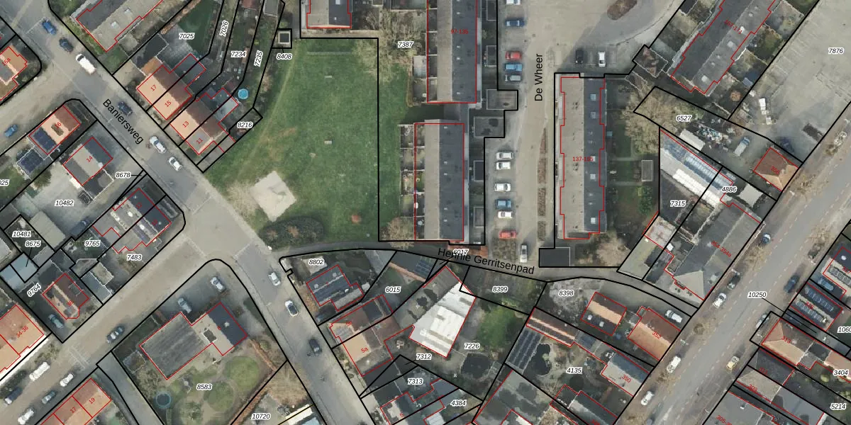 Het perceel waarop De Wheer 127 staat heeft een oppervlakte van 2527 m². Dit is een zeer groot perceel. De perceeloppervlakte wordt geregistreerd door het Kadaster. Gedetailleerde informatie over de maten van dit perceel kunt u vinden in het rapport Kadastrale kaart met maatvoering van De Wheer 127.