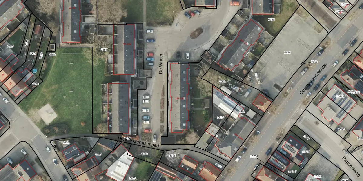 Het perceel waarop De Wheer 151 staat heeft een oppervlakte van 3579 m². Dit is een zeer groot perceel. De perceeloppervlakte wordt geregistreerd door het Kadaster. Gedetailleerde informatie over de maten van dit perceel kunt u vinden in het rapport Kadastrale kaart met maatvoering van De Wheer 151.