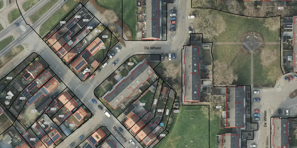 Het perceel waarop De Wheer 19 staat heeft een oppervlakte van 1025 m². Dit is een zeer groot perceel. De perceeloppervlakte wordt geregistreerd door het Kadaster. Gedetailleerde informatie over de maten van dit perceel kunt u vinden in het rapport Kadastrale kaart met maatvoering van De Wheer 19.