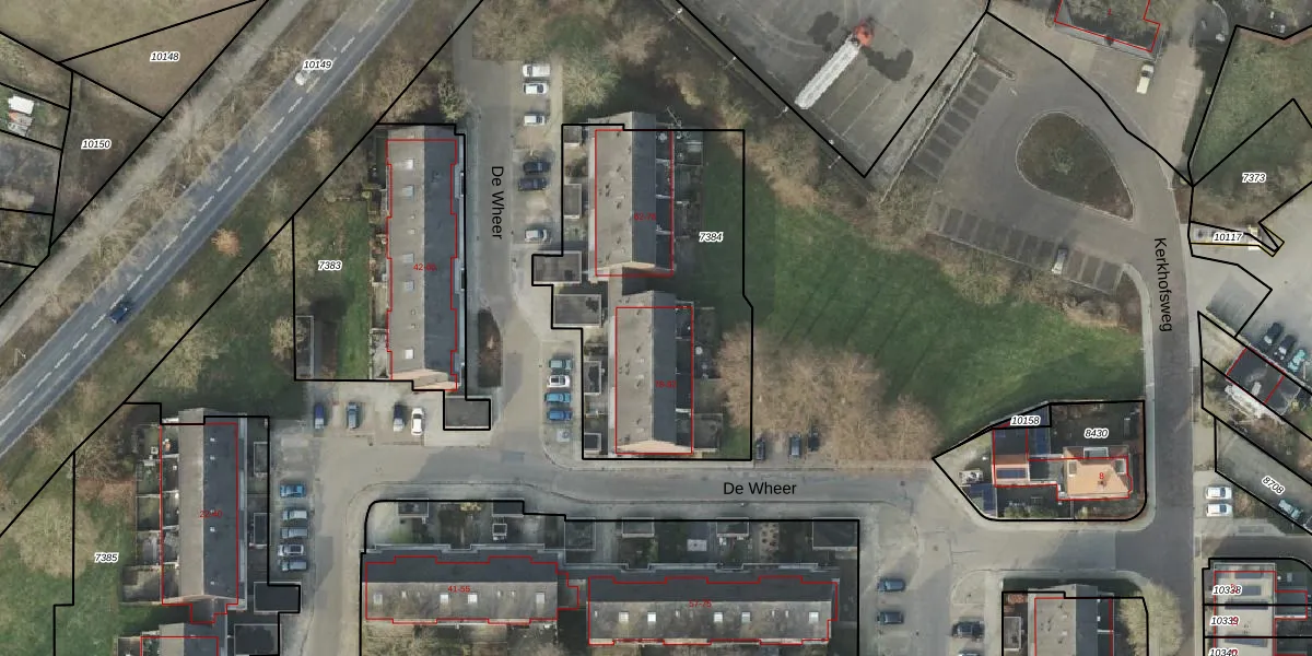 Het perceel waarop De Wheer 78 staat heeft een oppervlakte van 1382 m². Dit is een zeer groot perceel. De perceeloppervlakte wordt geregistreerd door het Kadaster. Gedetailleerde informatie over de maten van dit perceel kunt u vinden in het rapport Kadastrale kaart met maatvoering van De Wheer 78.