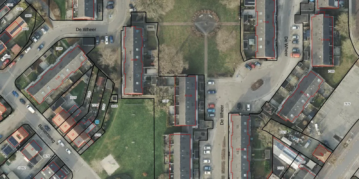 Het perceel waarop De Wheer 99 staat heeft een oppervlakte van 2527 m². Dit is een zeer groot perceel. De perceeloppervlakte wordt geregistreerd door het Kadaster. Gedetailleerde informatie over de maten van dit perceel kunt u vinden in het rapport Kadastrale kaart met maatvoering van De Wheer 99.