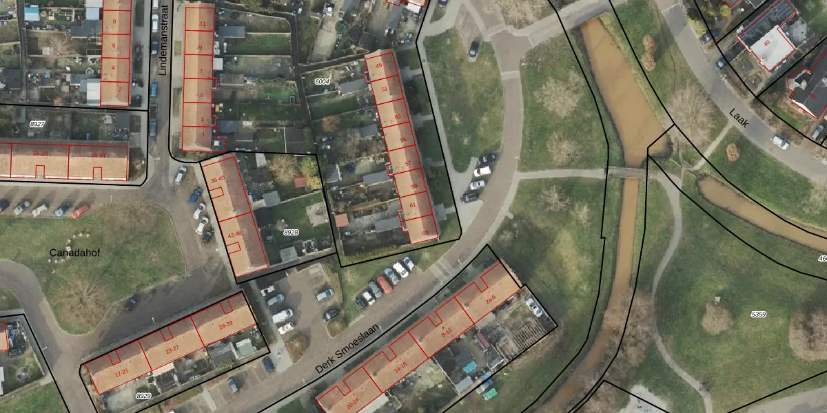 Het perceel waarop Derk Smoeslaan 61 staat heeft een oppervlakte van 4380 m². Dit is een zeer groot perceel. De perceeloppervlakte wordt geregistreerd door het Kadaster. Gedetailleerde informatie over de maten van dit perceel kunt u vinden in het rapport Kadastrale kaart met maatvoering van Derk Smoeslaan 61.