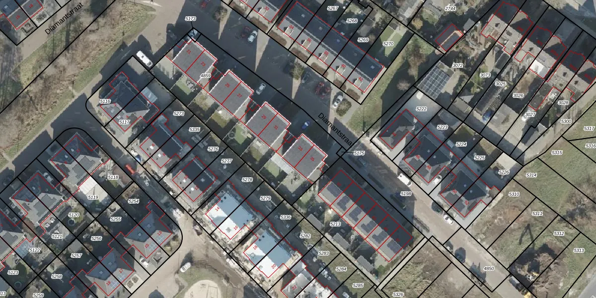 Het perceel waarop Diamantstraat 33 staat heeft een oppervlakte van 1580 m². Dit is een zeer groot perceel. De perceeloppervlakte wordt geregistreerd door het Kadaster. Gedetailleerde informatie over de maten van dit perceel kunt u vinden in het rapport Kadastrale kaart met maatvoering van Diamantstraat 33.