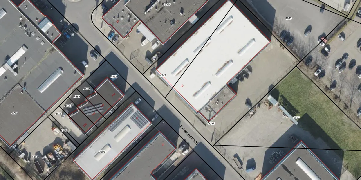 Edisonstraat 12 is gelegen op kadastraal perceel AML01G4244. Deze kadastrale aanduiding is uniek en wordt gebruikt door het Kadaster om eigendomsrechten en andere zakelijke rechten vast te leggen. Het perceel maakt onderdeel uit van de kadastrale gemeente Ambt-Almelo.