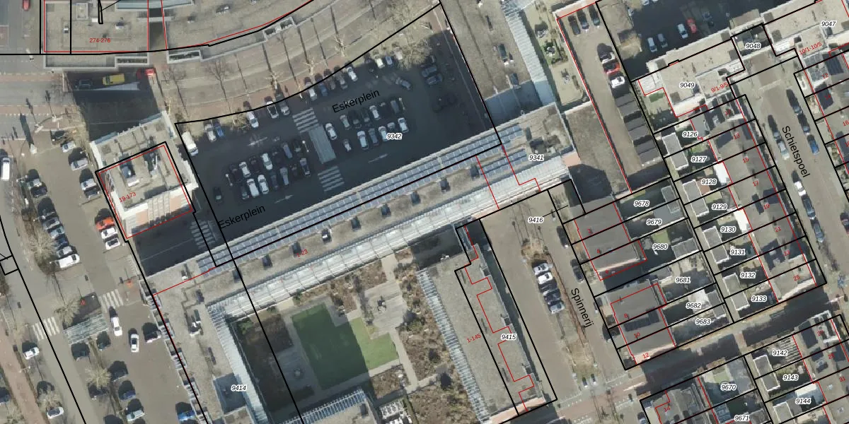 Het perceel waarop Eskerplein 103 staat heeft een oppervlakte van 5770 m². Dit is een zeer groot perceel. De perceeloppervlakte wordt geregistreerd door het Kadaster. Gedetailleerde informatie over de maten van dit perceel kunt u vinden in het rapport Kadastrale kaart met maatvoering van Eskerplein 103.