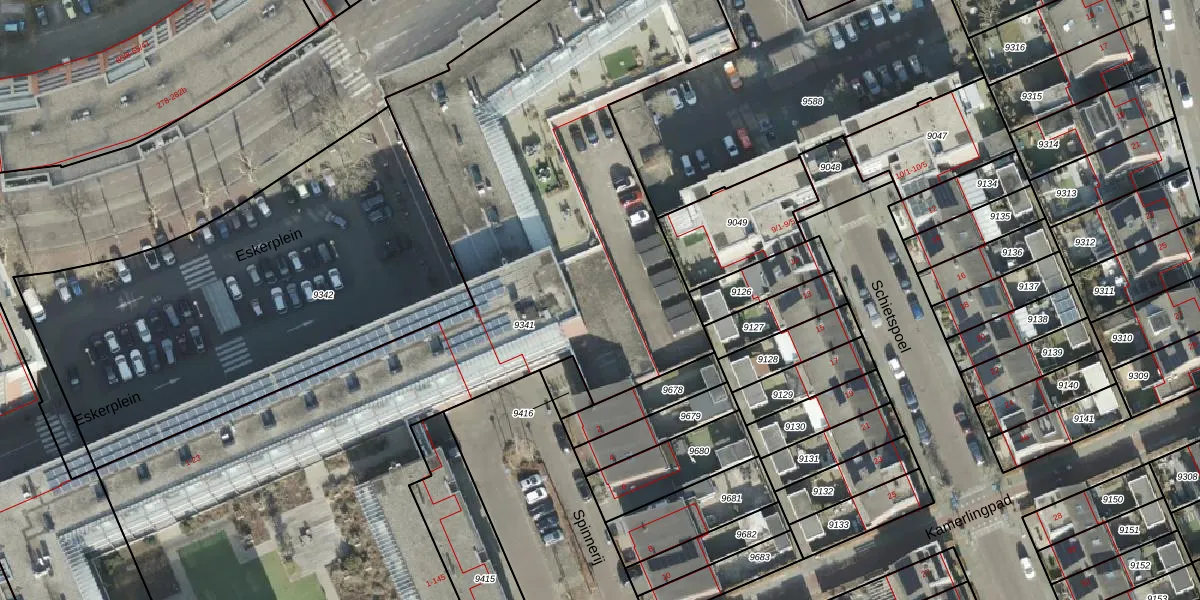 Het perceel waarop Eskerplein 20 staat heeft een oppervlakte van 5770 m². Dit is een zeer groot perceel. De perceeloppervlakte wordt geregistreerd door het Kadaster. Gedetailleerde informatie over de maten van dit perceel kunt u vinden in het rapport Kadastrale kaart met maatvoering van Eskerplein 20.