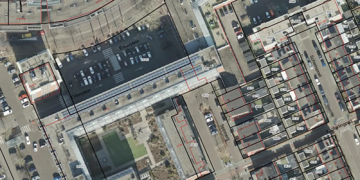 Het perceel waarop Eskerplein 21 staat heeft een oppervlakte van 5770 m². Dit is een zeer groot perceel. De perceeloppervlakte wordt geregistreerd door het Kadaster. Gedetailleerde informatie over de maten van dit perceel kunt u vinden in het rapport Kadastrale kaart met maatvoering van Eskerplein 21.