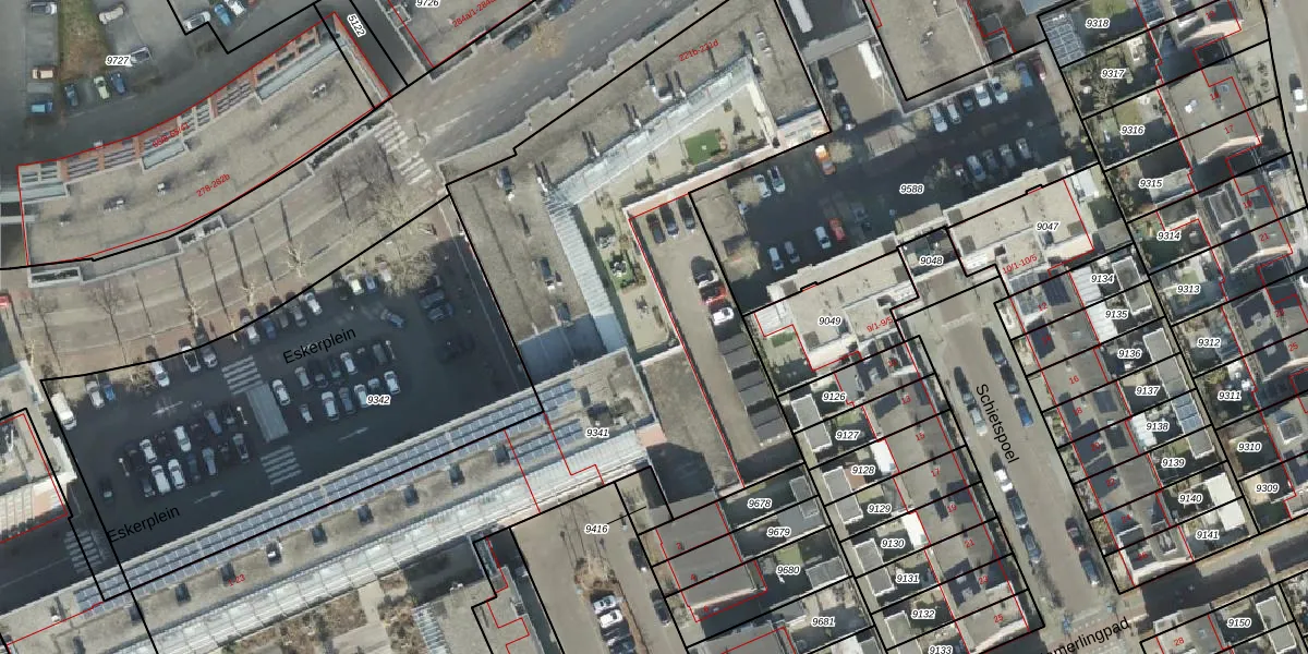 Het perceel waarop Eskerplein 24 staat heeft een oppervlakte van 5770 m². Dit is een zeer groot perceel. De perceeloppervlakte wordt geregistreerd door het Kadaster. Gedetailleerde informatie over de maten van dit perceel kunt u vinden in het rapport Kadastrale kaart met maatvoering van Eskerplein 24.