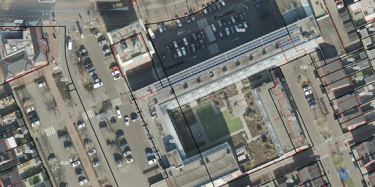 Het perceel waarop Eskerplein 77 staat heeft een oppervlakte van 5770 m². Dit is een zeer groot perceel. De perceeloppervlakte wordt geregistreerd door het Kadaster. Gedetailleerde informatie over de maten van dit perceel kunt u vinden in het rapport Kadastrale kaart met maatvoering van Eskerplein 77.