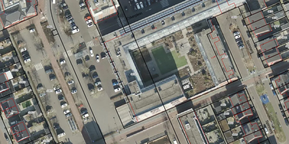Het perceel waarop Eskerplein 87 staat heeft een oppervlakte van 1978 m². Dit is een zeer groot perceel. De perceeloppervlakte wordt geregistreerd door het Kadaster. Gedetailleerde informatie over de maten van dit perceel kunt u vinden in het rapport Kadastrale kaart met maatvoering van Eskerplein 87.