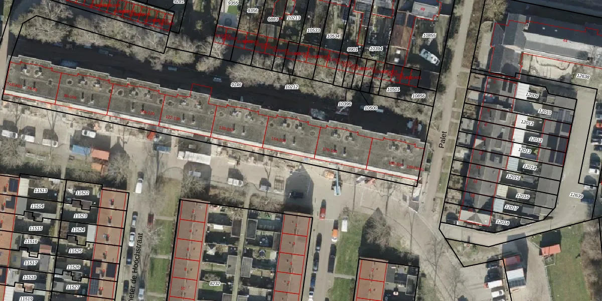 Het perceel waarop Gerard Doustraat 162 staat heeft een oppervlakte van 3940 m². Dit is een zeer groot perceel. De perceeloppervlakte wordt geregistreerd door het Kadaster. Gedetailleerde informatie over de maten van dit perceel kunt u vinden in het rapport Kadastrale kaart met maatvoering van Gerard Doustraat 162.