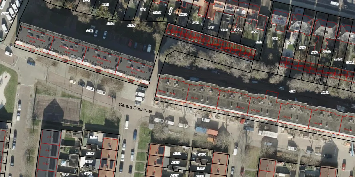 Het perceel waarop Gerard Doustraat 86 staat heeft een oppervlakte van 3940 m². Dit is een zeer groot perceel. De perceeloppervlakte wordt geregistreerd door het Kadaster. Gedetailleerde informatie over de maten van dit perceel kunt u vinden in het rapport Kadastrale kaart met maatvoering van Gerard Doustraat 86.