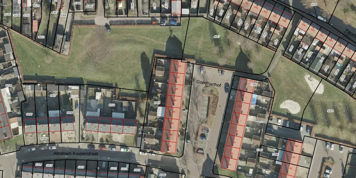 Het perceel waarop Goedharthof 48 staat heeft een oppervlakte van 1270 m². Dit is een zeer groot perceel. De perceeloppervlakte wordt geregistreerd door het Kadaster. Gedetailleerde informatie over de maten van dit perceel kunt u vinden in het rapport Kadastrale kaart met maatvoering van Goedharthof 48.