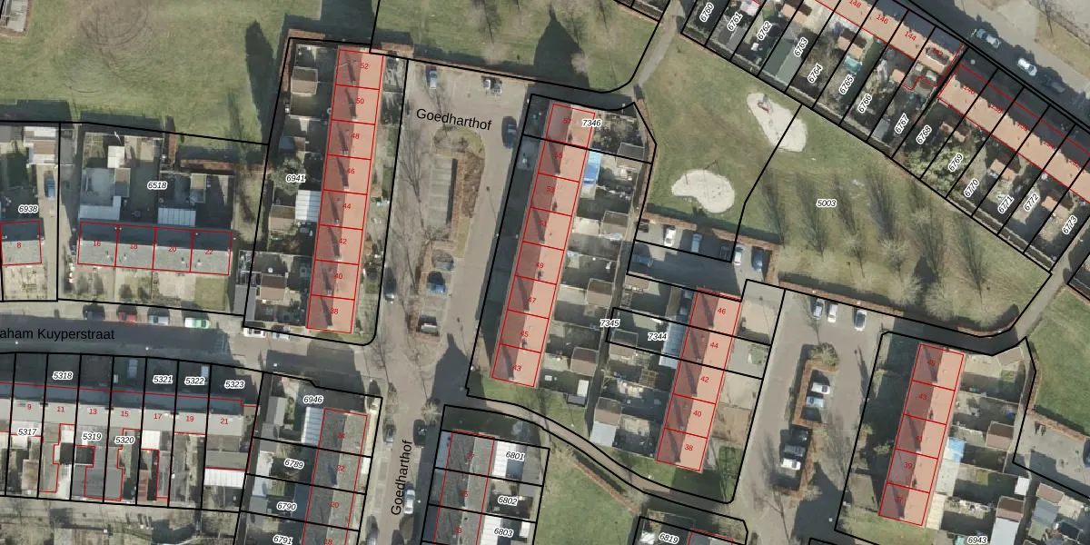 Het perceel waarop Goedharthof 49 staat heeft een oppervlakte van 2060 m². Dit is een zeer groot perceel. De perceeloppervlakte wordt geregistreerd door het Kadaster. Gedetailleerde informatie over de maten van dit perceel kunt u vinden in het rapport Kadastrale kaart met maatvoering van Goedharthof 49.