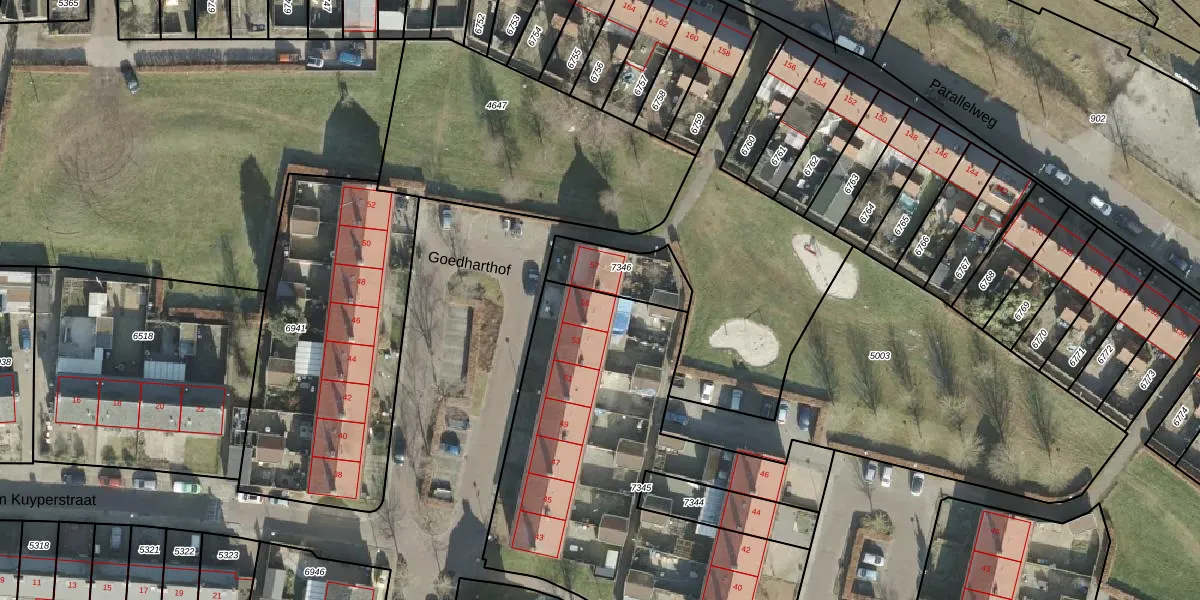 Het perceel waarop Goedharthof 55 staat heeft een oppervlakte van 2060 m². Dit is een zeer groot perceel. De perceeloppervlakte wordt geregistreerd door het Kadaster. Gedetailleerde informatie over de maten van dit perceel kunt u vinden in het rapport Kadastrale kaart met maatvoering van Goedharthof 55.