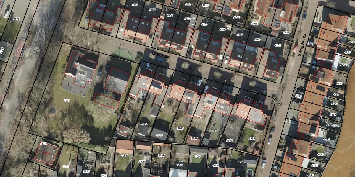 Het perceel waarop Graskom 12 staat heeft een oppervlakte van 405 m². Dit is een groot perceel. De perceeloppervlakte wordt geregistreerd door het Kadaster. Gedetailleerde informatie over de maten van dit perceel kunt u vinden in het rapport Kadastrale kaart met maatvoering van Graskom 12.