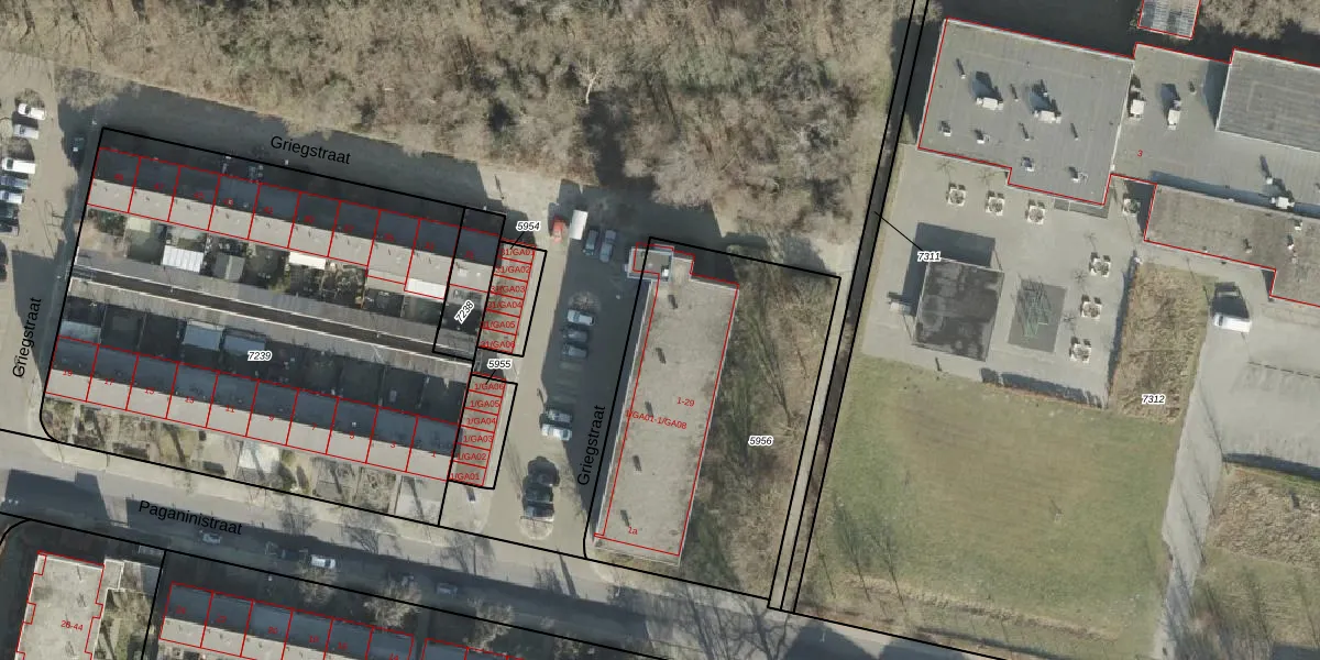 Griegstraat 1-GA02 is gelegen op kadastraal perceel AML01A5956. Deze kadastrale aanduiding is uniek en wordt gebruikt door het Kadaster om eigendomsrechten en andere zakelijke rechten vast te leggen. Het perceel maakt onderdeel uit van de kadastrale gemeente Ambt-Almelo.