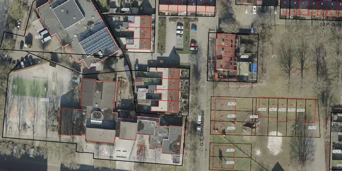Het perceel waarop G.T. Rietveldstraat 39 staat heeft een oppervlakte van 855 m². Dit is een groot perceel. De perceeloppervlakte wordt geregistreerd door het Kadaster. Gedetailleerde informatie over de maten van dit perceel kunt u vinden in het rapport Kadastrale kaart met maatvoering van G.T. Rietveldstraat 39.