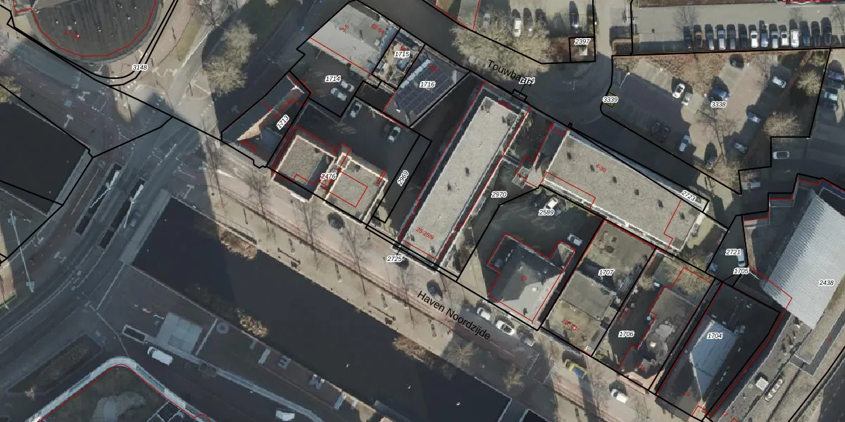 Het perceel waarop Haven Noordzijde 25-2 staat heeft een oppervlakte van 1706 m². Dit is een zeer groot perceel. De perceeloppervlakte wordt geregistreerd door het Kadaster. Gedetailleerde informatie over de maten van dit perceel kunt u vinden in het rapport Kadastrale kaart met maatvoering van Haven Noordzijde 25-2.