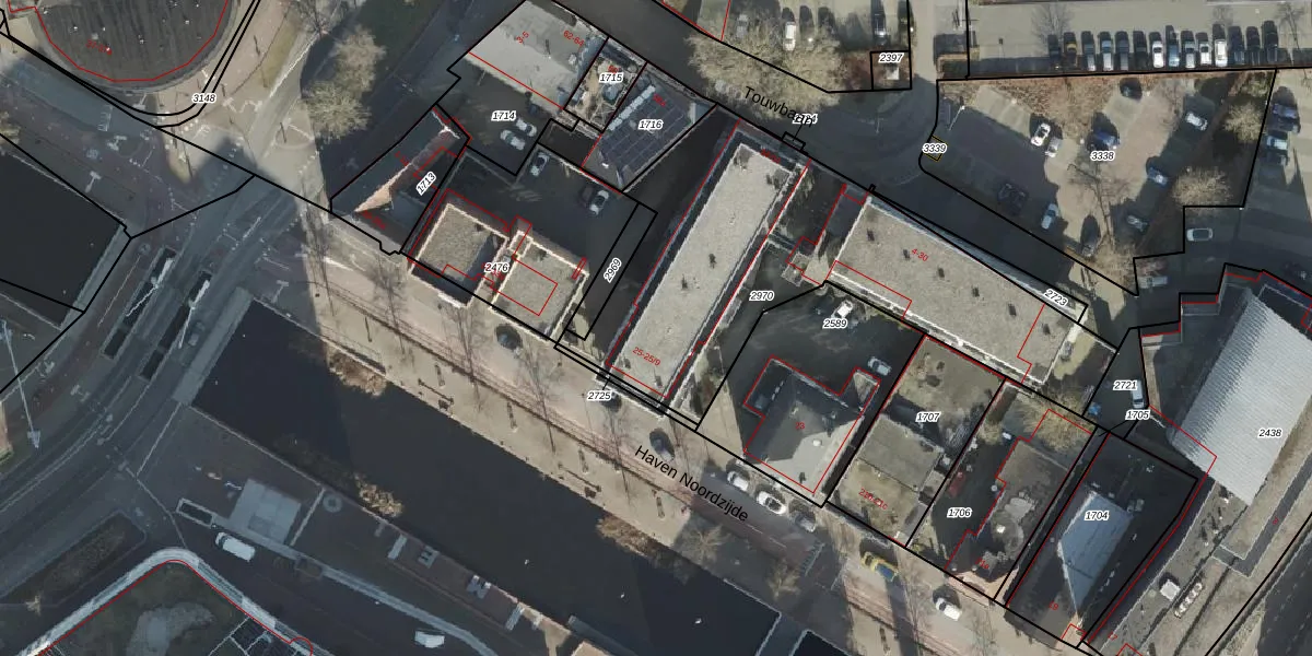 Het perceel waarop Haven Noordzijde 25-4 staat heeft een oppervlakte van 1706 m². Dit is een zeer groot perceel. De perceeloppervlakte wordt geregistreerd door het Kadaster. Gedetailleerde informatie over de maten van dit perceel kunt u vinden in het rapport Kadastrale kaart met maatvoering van Haven Noordzijde 25-4.