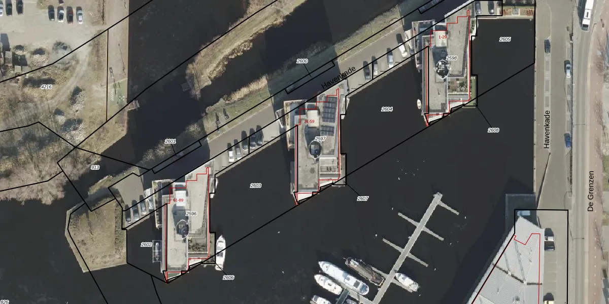 Het perceel waarop Havenkade 39 staat heeft een oppervlakte van 631 m². Dit is een groot perceel. De perceeloppervlakte wordt geregistreerd door het Kadaster. Gedetailleerde informatie over de maten van dit perceel kunt u vinden in het rapport Kadastrale kaart met maatvoering van Havenkade 39.