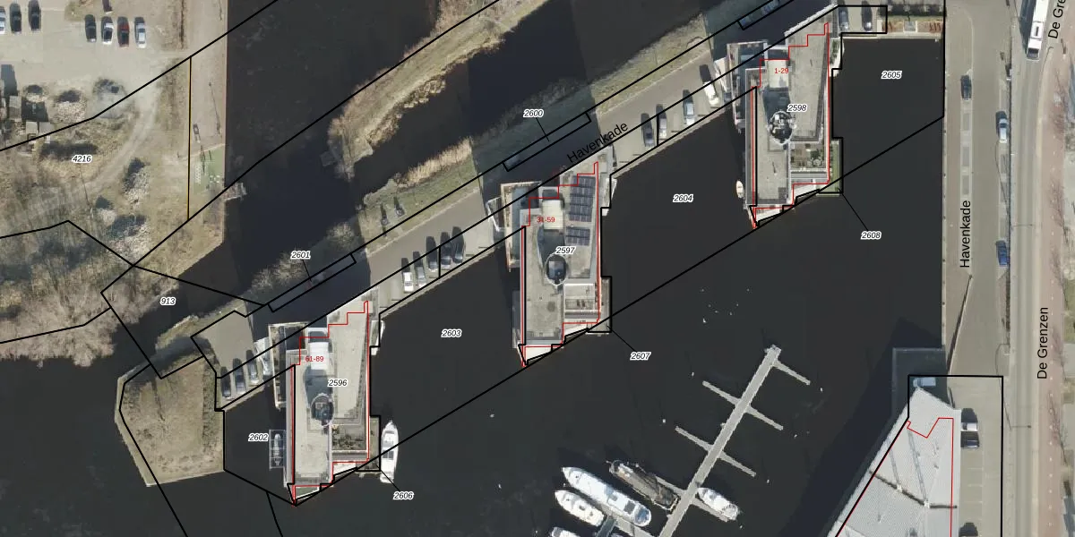 Het perceel waarop Havenkade 51 staat heeft een oppervlakte van 631 m². Dit is een groot perceel. De perceeloppervlakte wordt geregistreerd door het Kadaster. Gedetailleerde informatie over de maten van dit perceel kunt u vinden in het rapport Kadastrale kaart met maatvoering van Havenkade 51.