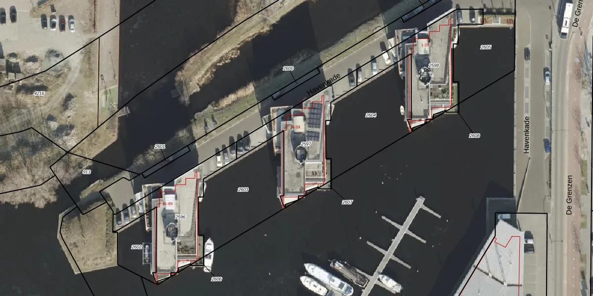 Het perceel waarop Havenkade 53 staat heeft een oppervlakte van 631 m². Dit is een groot perceel. De perceeloppervlakte wordt geregistreerd door het Kadaster. Gedetailleerde informatie over de maten van dit perceel kunt u vinden in het rapport Kadastrale kaart met maatvoering van Havenkade 53.