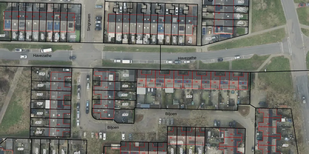 Het perceel waarop Havezathe 106 staat heeft een oppervlakte van 1807 m². Dit is een zeer groot perceel. De perceeloppervlakte wordt geregistreerd door het Kadaster. Gedetailleerde informatie over de maten van dit perceel kunt u vinden in het rapport Kadastrale kaart met maatvoering van Havezathe 106.