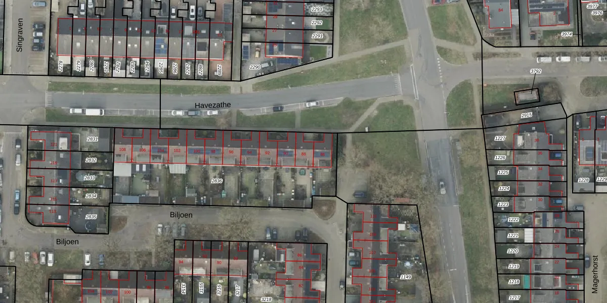 Het perceel waarop Havezathe 88 staat heeft een oppervlakte van 1807 m². Dit is een zeer groot perceel. De perceeloppervlakte wordt geregistreerd door het Kadaster. Gedetailleerde informatie over de maten van dit perceel kunt u vinden in het rapport Kadastrale kaart met maatvoering van Havezathe 88.