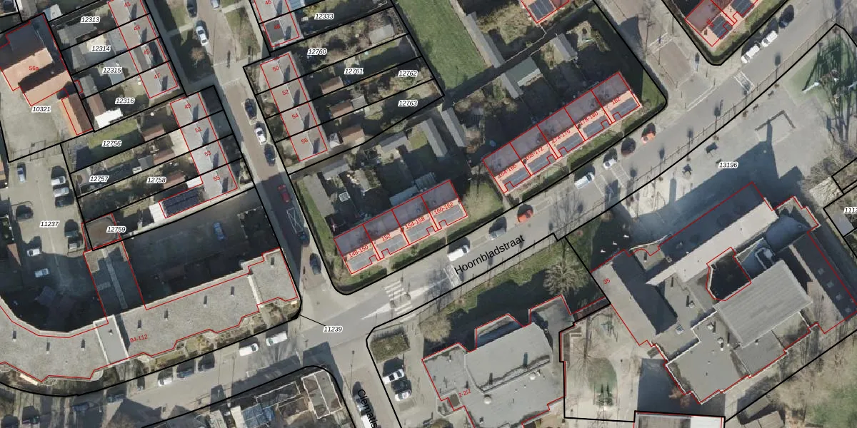 Hoornbladstraat 158 is gelegen op kadastraal perceel AML01H8288. Deze kadastrale aanduiding is uniek en wordt gebruikt door het Kadaster om eigendomsrechten en andere zakelijke rechten vast te leggen. Het perceel maakt onderdeel uit van de kadastrale gemeente Ambt-Almelo.