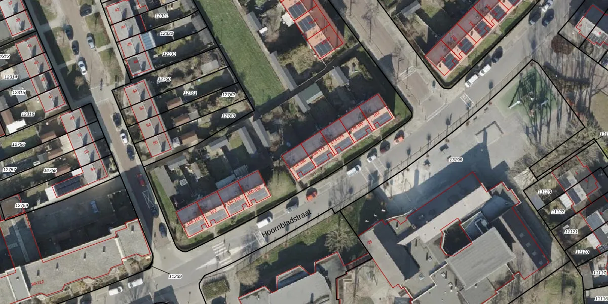 Het perceel waarop Hoornbladstraat 166 staat heeft een oppervlakte van 8510 m². Dit is een zeer groot perceel. De perceeloppervlakte wordt geregistreerd door het Kadaster. Gedetailleerde informatie over de maten van dit perceel kunt u vinden in het rapport Kadastrale kaart met maatvoering van Hoornbladstraat 166.