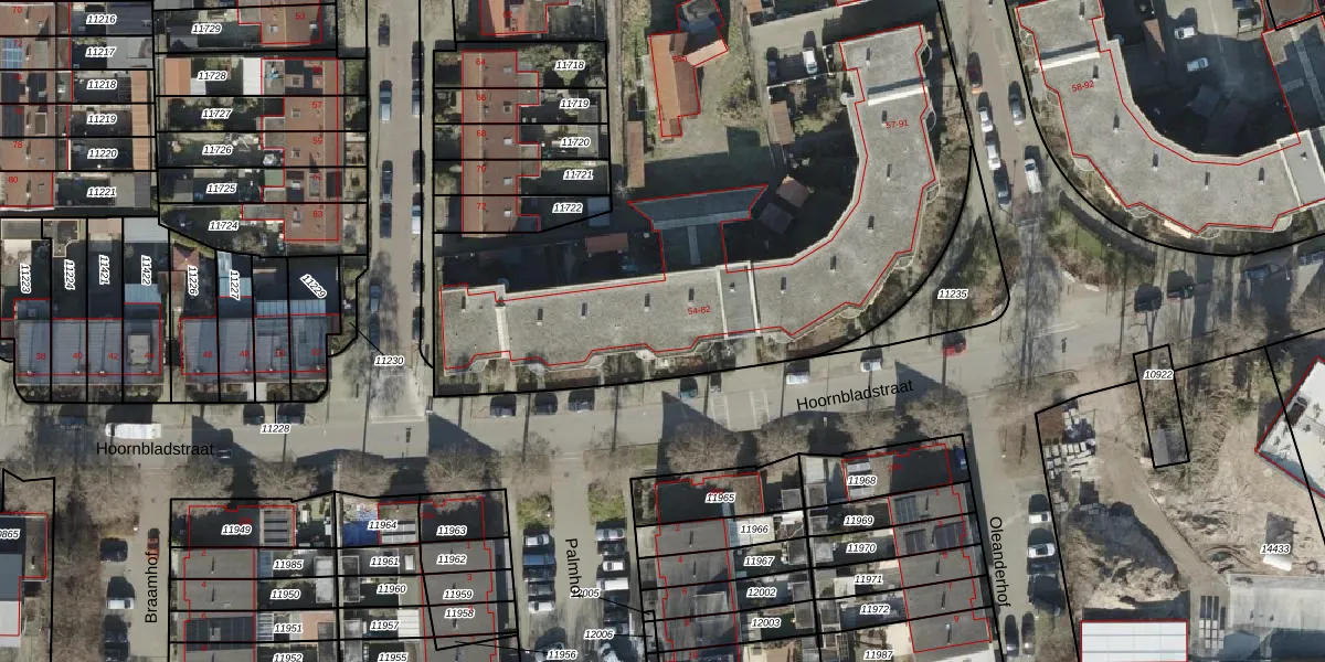 Het perceel waarop Hoornbladstraat 82 staat heeft een oppervlakte van 8447 m². Dit is een zeer groot perceel. De perceeloppervlakte wordt geregistreerd door het Kadaster. Gedetailleerde informatie over de maten van dit perceel kunt u vinden in het rapport Kadastrale kaart met maatvoering van Hoornbladstraat 82.