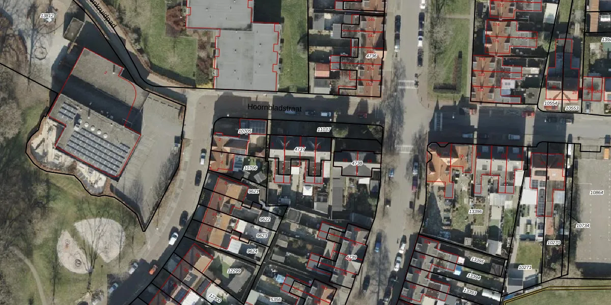 Hoornbladstraat 9 is gelegen op kadastraal perceel AML01H4737. Deze kadastrale aanduiding is uniek en wordt gebruikt door het Kadaster om eigendomsrechten en andere zakelijke rechten vast te leggen. Het perceel maakt onderdeel uit van de kadastrale gemeente Ambt-Almelo.