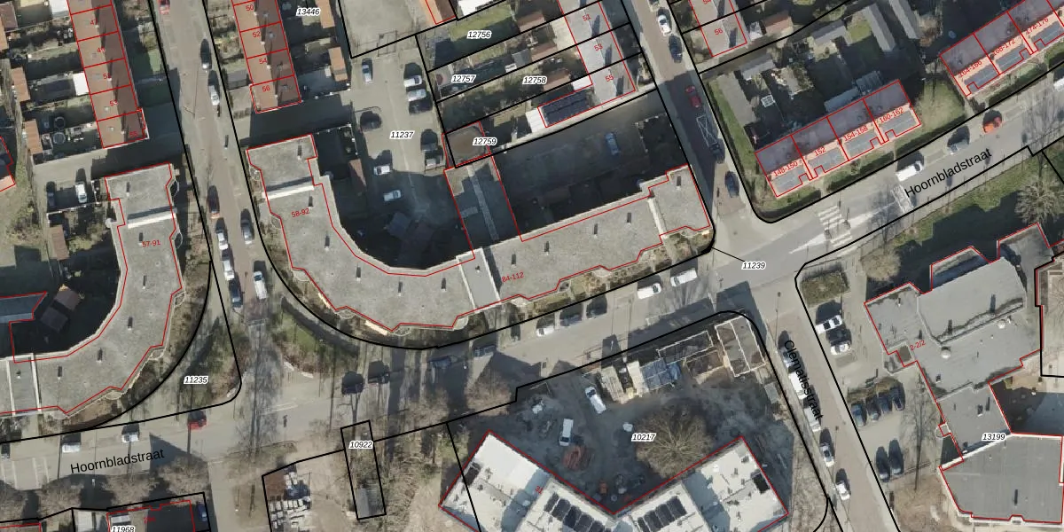 Hoornbladstraat 94 is gelegen op kadastraal perceel AML01H11237. Deze kadastrale aanduiding is uniek en wordt gebruikt door het Kadaster om eigendomsrechten en andere zakelijke rechten vast te leggen. Het perceel maakt onderdeel uit van de kadastrale gemeente Ambt-Almelo.
