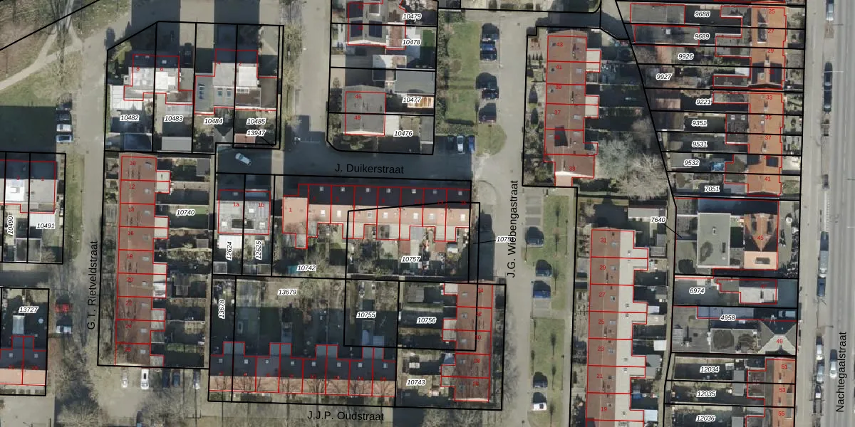 Het perceel waarop J. Duikerstraat 13 staat heeft een oppervlakte van 510 m². Dit is een groot perceel. De perceeloppervlakte wordt geregistreerd door het Kadaster. Gedetailleerde informatie over de maten van dit perceel kunt u vinden in het rapport Kadastrale kaart met maatvoering van J. Duikerstraat 13.