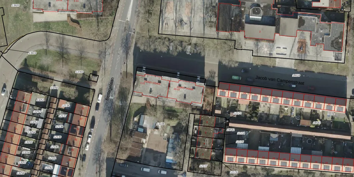 Het perceel waarop Jacob van Campenstraat 13 staat heeft een oppervlakte van 2103 m². Dit is een zeer groot perceel. De perceeloppervlakte wordt geregistreerd door het Kadaster. Gedetailleerde informatie over de maten van dit perceel kunt u vinden in het rapport Kadastrale kaart met maatvoering van Jacob van Campenstraat 13.