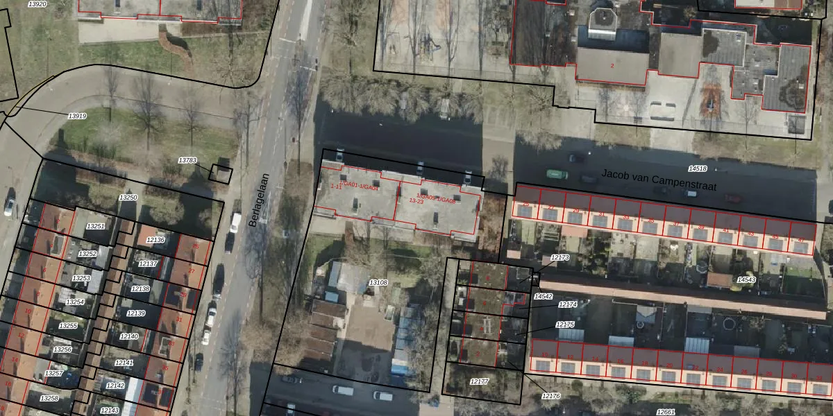 Het perceel waarop Jacob van Campenstraat 15 staat heeft een oppervlakte van 2103 m². Dit is een zeer groot perceel. De perceeloppervlakte wordt geregistreerd door het Kadaster. Gedetailleerde informatie over de maten van dit perceel kunt u vinden in het rapport Kadastrale kaart met maatvoering van Jacob van Campenstraat 15.