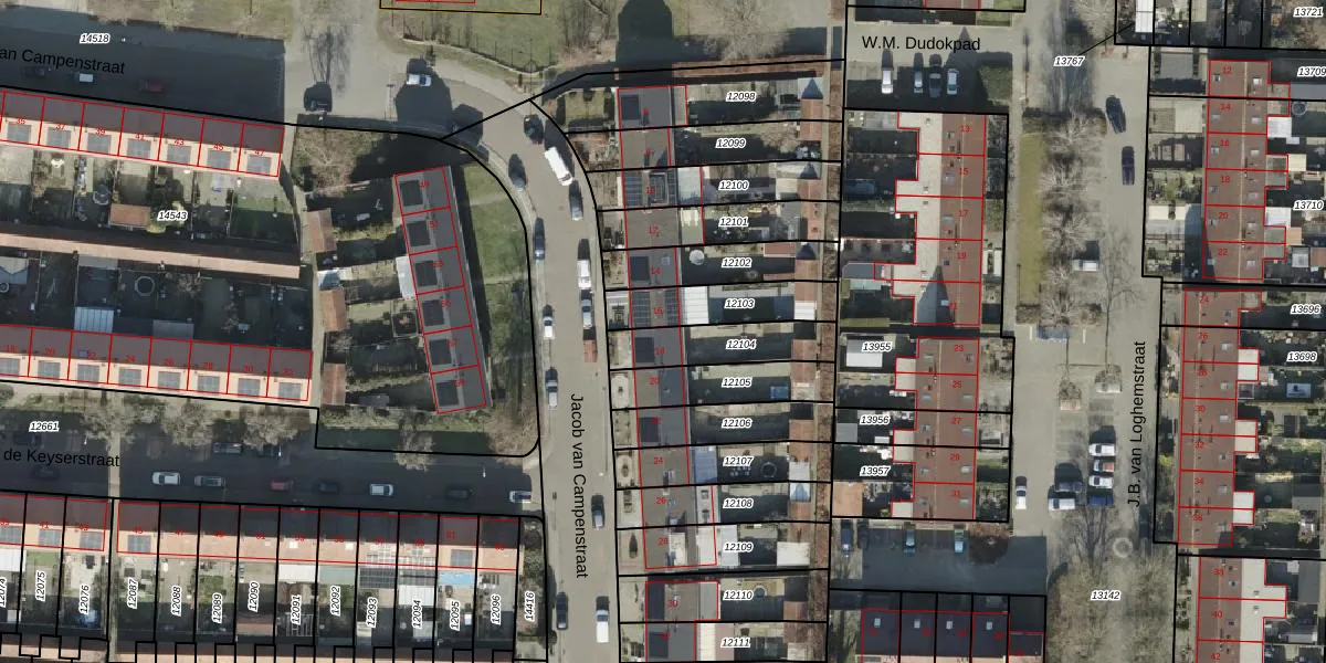 Jacob van Campenstraat 18 is gelegen op kadastraal perceel AML01H12104. Deze kadastrale aanduiding is uniek en wordt gebruikt door het Kadaster om eigendomsrechten en andere zakelijke rechten vast te leggen. Het perceel maakt onderdeel uit van de kadastrale gemeente Ambt-Almelo.