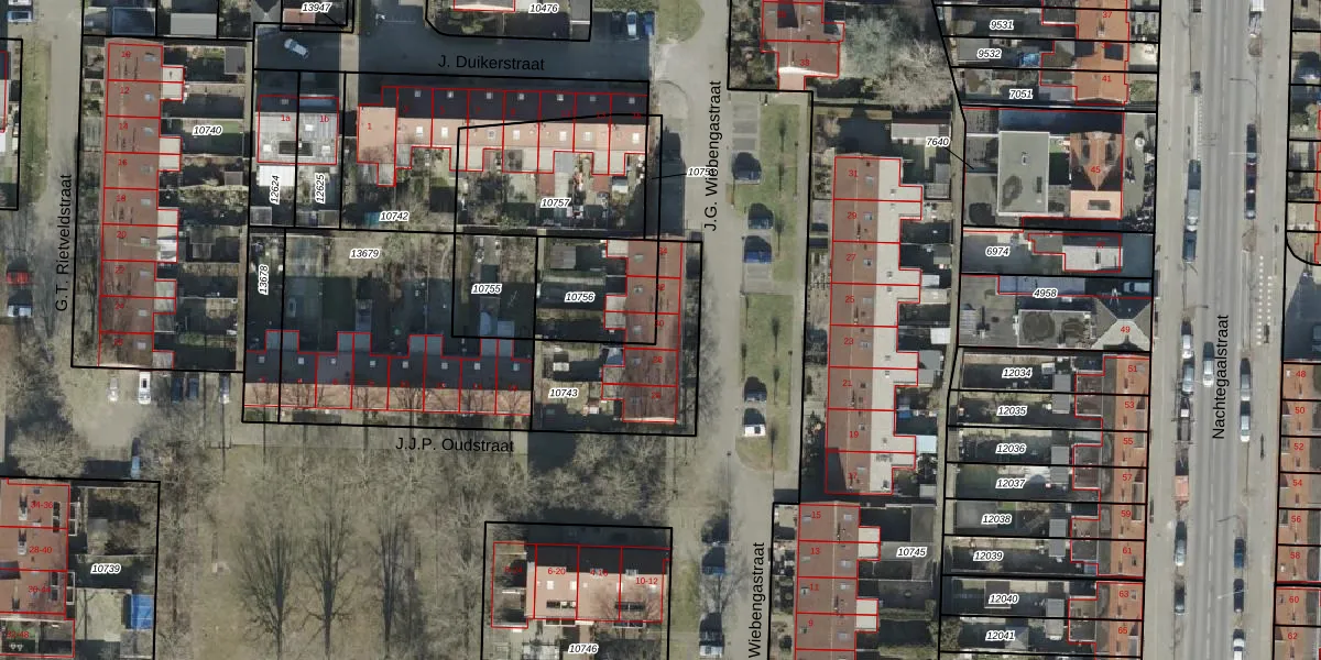 Het perceel waarop J.G. Wiebengastraat 30 staat heeft een oppervlakte van 449 m². Dit is een groot perceel. De perceeloppervlakte wordt geregistreerd door het Kadaster. Gedetailleerde informatie over de maten van dit perceel kunt u vinden in het rapport Kadastrale kaart met maatvoering van J.G. Wiebengastraat 30.