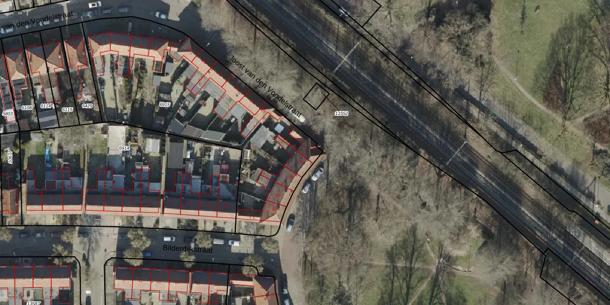 Het perceel waarop Joost van den Vondelstraat 31 staat heeft een oppervlakte van 2410 m². Dit is een zeer groot perceel. De perceeloppervlakte wordt geregistreerd door het Kadaster. Gedetailleerde informatie over de maten van dit perceel kunt u vinden in het rapport Kadastrale kaart met maatvoering van Joost van den Vondelstraat 31.