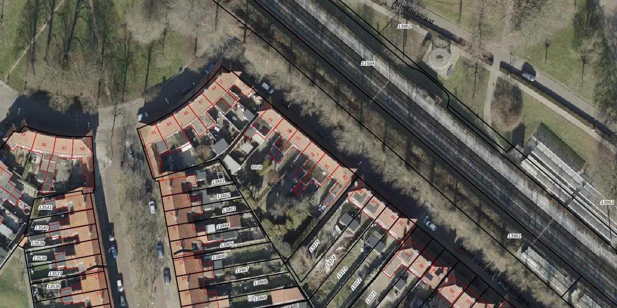 Het perceel waarop Joost van den Vondelstraat 79 staat heeft een oppervlakte van 1960 m². Dit is een zeer groot perceel. De perceeloppervlakte wordt geregistreerd door het Kadaster. Gedetailleerde informatie over de maten van dit perceel kunt u vinden in het rapport Kadastrale kaart met maatvoering van Joost van den Vondelstraat 79.