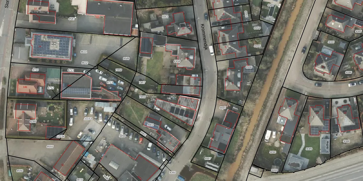 Krommendijk 14 is gelegen op kadastraal perceel AML01B7857. Deze kadastrale aanduiding is uniek en wordt gebruikt door het Kadaster om eigendomsrechten en andere zakelijke rechten vast te leggen. Het perceel maakt onderdeel uit van de kadastrale gemeente Ambt-Almelo.