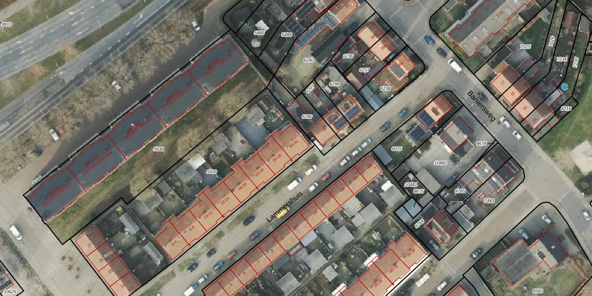 Het perceel waarop Lammershuis 32 staat heeft een oppervlakte van 2200 m². Dit is een zeer groot perceel. De perceeloppervlakte wordt geregistreerd door het Kadaster. Gedetailleerde informatie over de maten van dit perceel kunt u vinden in het rapport Kadastrale kaart met maatvoering van Lammershuis 32.